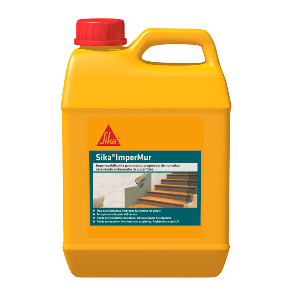 Impermeabilizante para muros, bloqueador de humedad ascendente y endurecedor de superficie. Sika® imper mur es una resina acuosa de impregnación, lista para usar como barrera impermeable en muros con humedad, consolidante de superficies arenosas débiles e imprimante para masillas acrílicas. Muy baja viscosidad (impregna fácilmente los poros). Transparente después del secado. Puede ser recubierto con estuco, pintura o papel de colgadura. Uso: Impermeabilización contra humedad por capilaridad. Barrera alcalina para evitar deterioro de pinturas y estucos. Imprimante de pinturas y estucos. Imprimante para mejorar adherencia de masillas acrílicas en sistemas livianos. Tratamiento de salitre (manchas blancas en el pañete). Prevención de aparición de moho y hongos. Consolidante de superficies arenosas. Ventajas: Muy baja viscosidad (impregna fácilmente los poros). Transparente después del secado. Puede ser recubierto con estuco, pintura o papel de colgadura. Puede ser usado en interiores y en exteriores. Resistente a rayos UV.