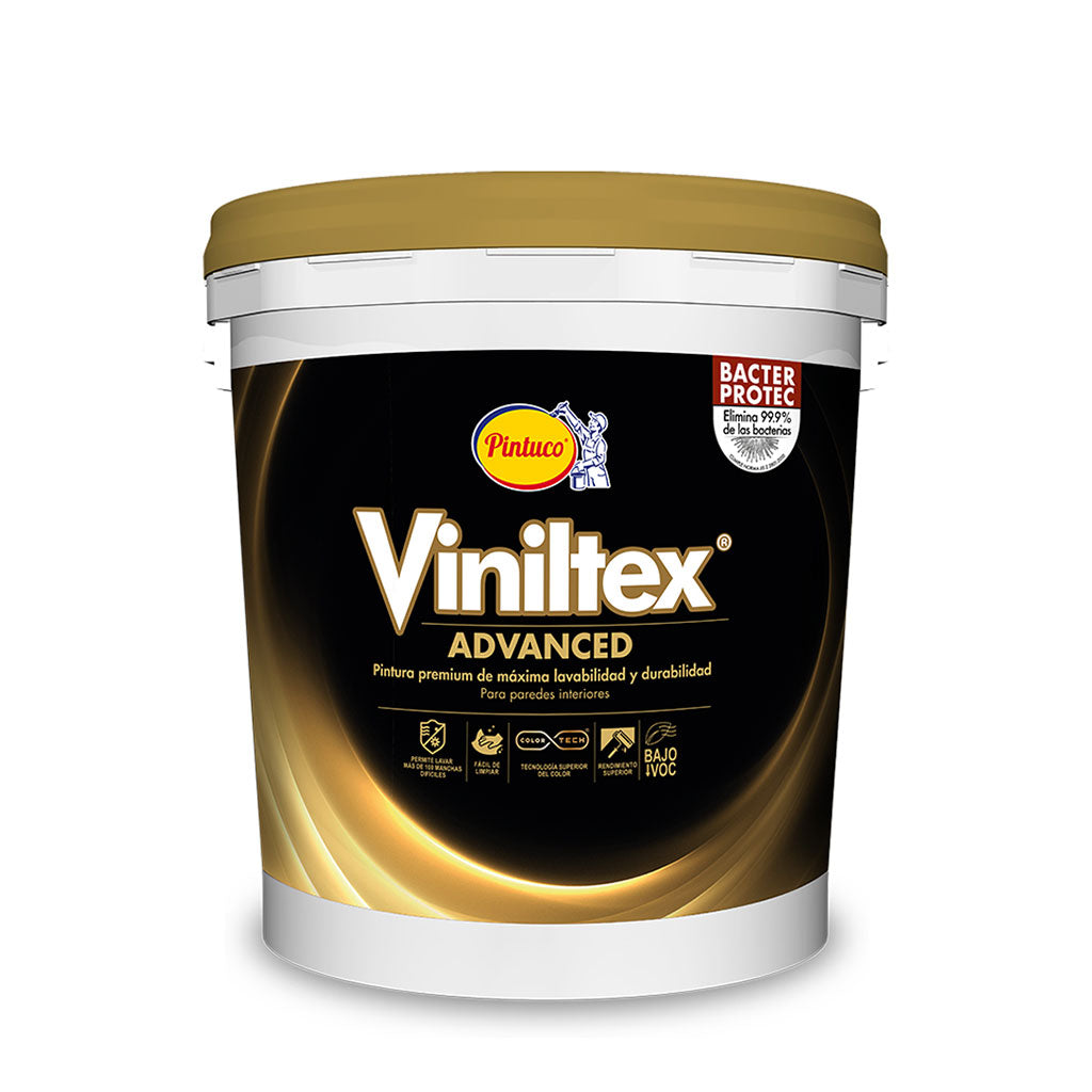 Recomendada para decorar y proteger muros y cielos rasos de residencias, oficinas, zonas de alto tráfico y edificaciones en general, en ambientes interiores y exteriores. Disponible en una amplia gama de colores. *En exteriores, la estabilidad de los colores del abanico que no están marcados con el símbolo del “sol”, surgió de las condiciones de intemperismo en las que se aplique. Viniltex Advanced es una pintura base premium agua que ofrece máxima lavabilidad y durabilidad. Es la marca #1 recomendada por pintores en Colombia. Protege ya la vez decora con color, siendo amigable con el medio ambiente por su bajo contenido VOC. Tiene un activo antibacteriano que elimina el 99,9% de las bacterias. Cuenta con nuestro desarrollo tecnológico del color, Colortech. Rendimiento: Sobre Estuco Profesional Pintuco de 20 a 25 m2/galón a dos manos. En repinte sobre color diferente de 30 a 40 m2/galón a dos manos. En repinte sobre color igual o similar de 40 a 50 m2/ galón a dos manos. Beneficios: Máxima duración y lavabilidad. Excelente resistencia a la abrasión. Única con tecnología superior del color ColorTech®. COV bajo Libre de APEO.